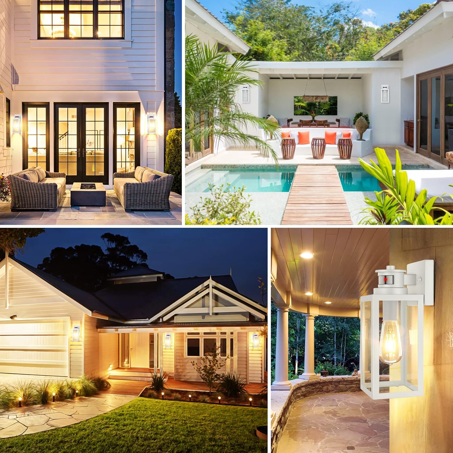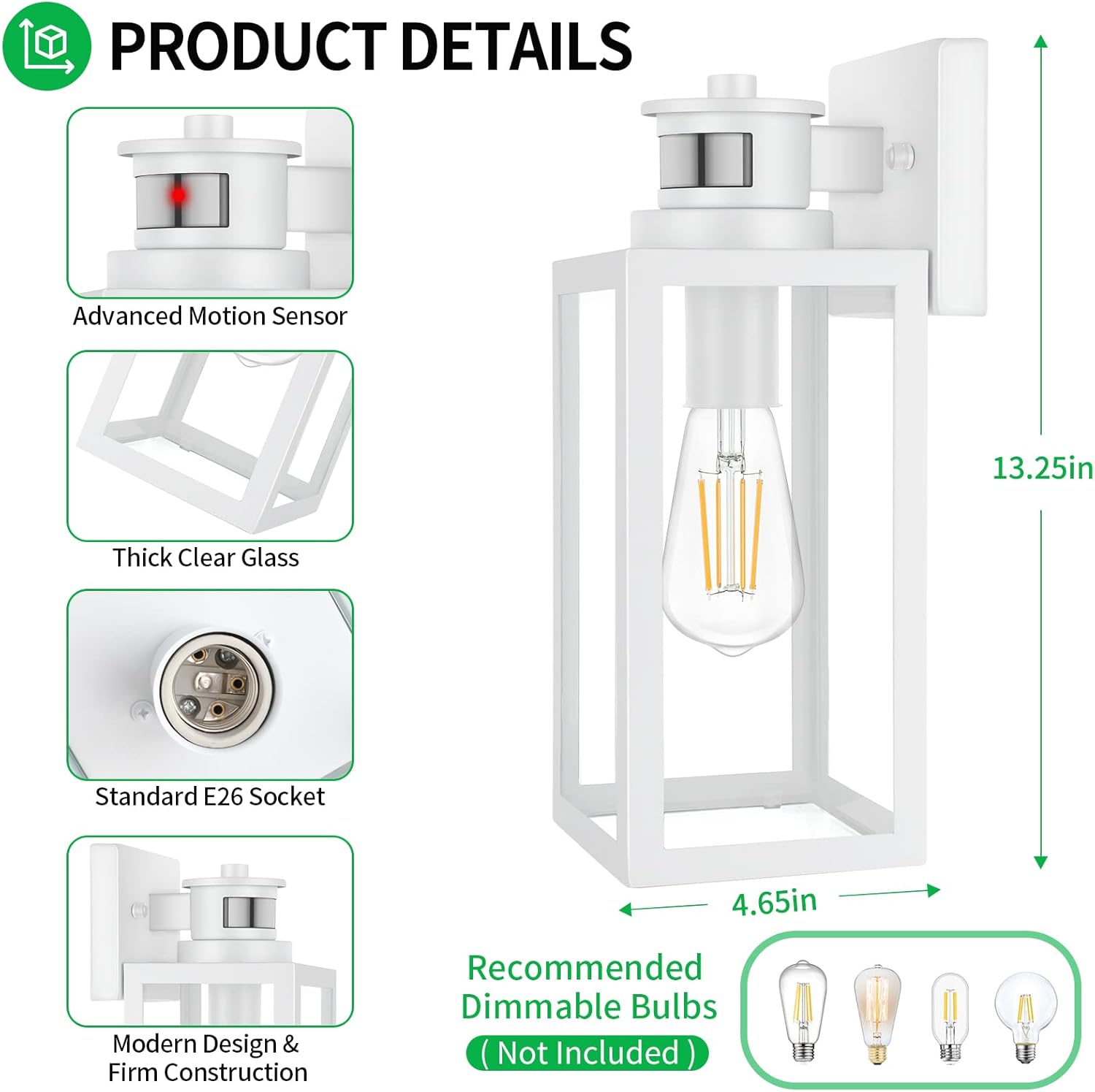 【Waterproof &Anti-rust Well-Made】Our motion sensor outdoor lanterns are made by metal and aluminum in white finish and sturdy clear glass, can be greatly used for years and endure any environment, being resistant for all weathers: rain or snow, ultra high or low temperatures. You will not worry these exterior lights for house will be rusted or corroded anymore