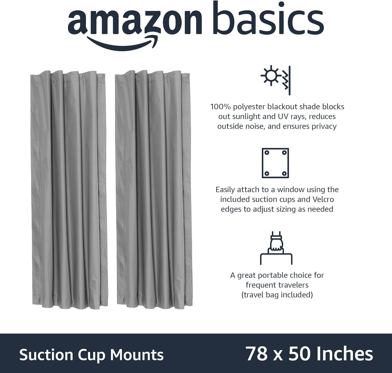 Be the first to review “Amazon Basics Portable Blackout Curtain Shade with Suction Cups, 50″ x 78″, 2-Pack, Dark Grey”