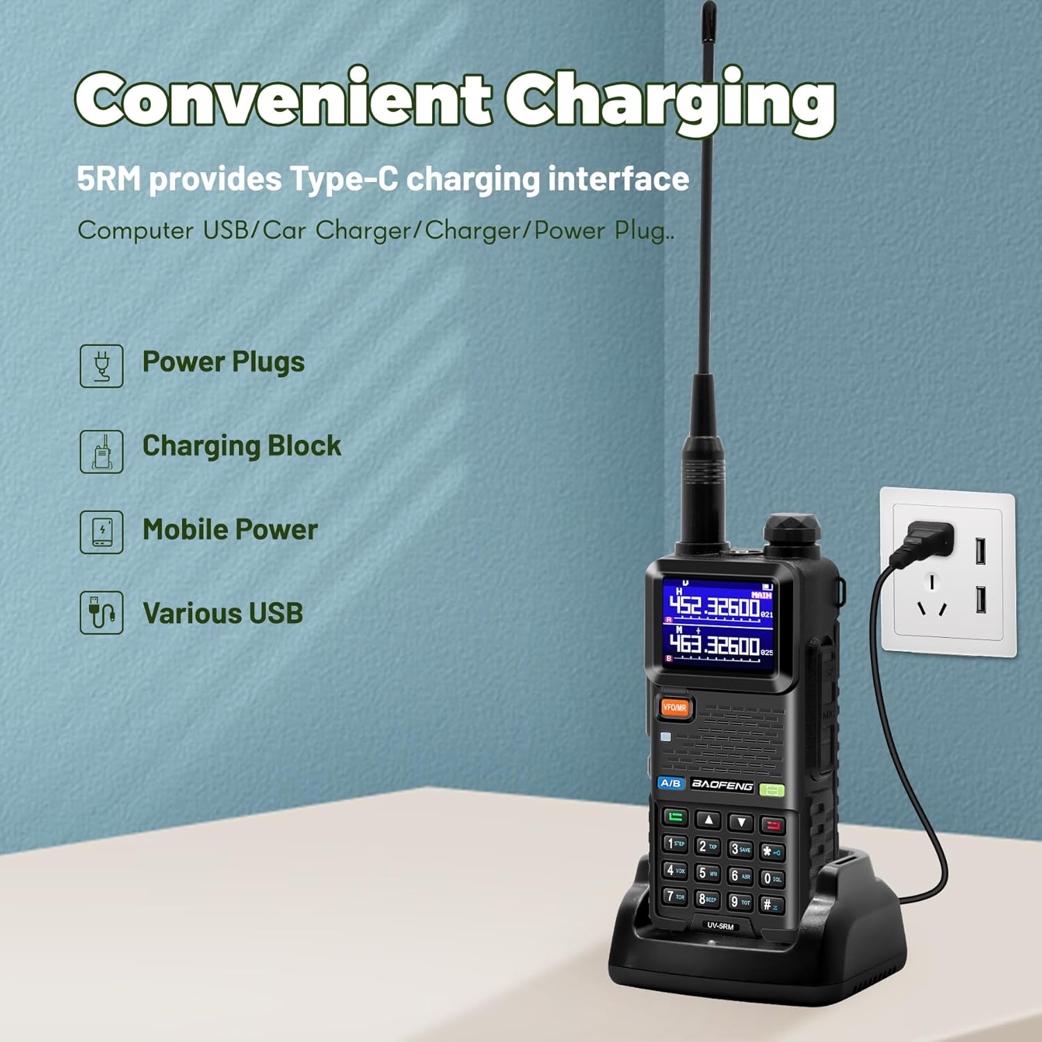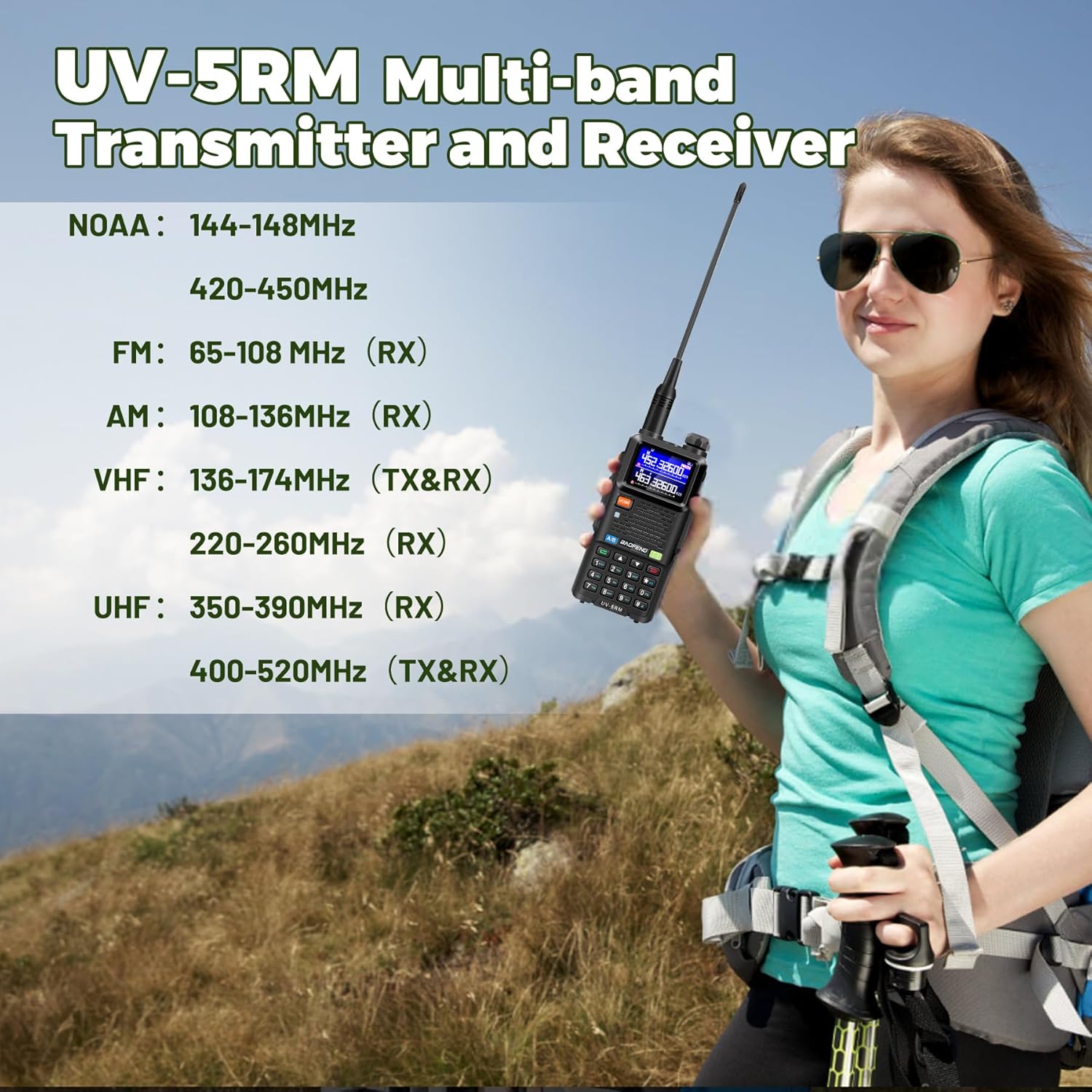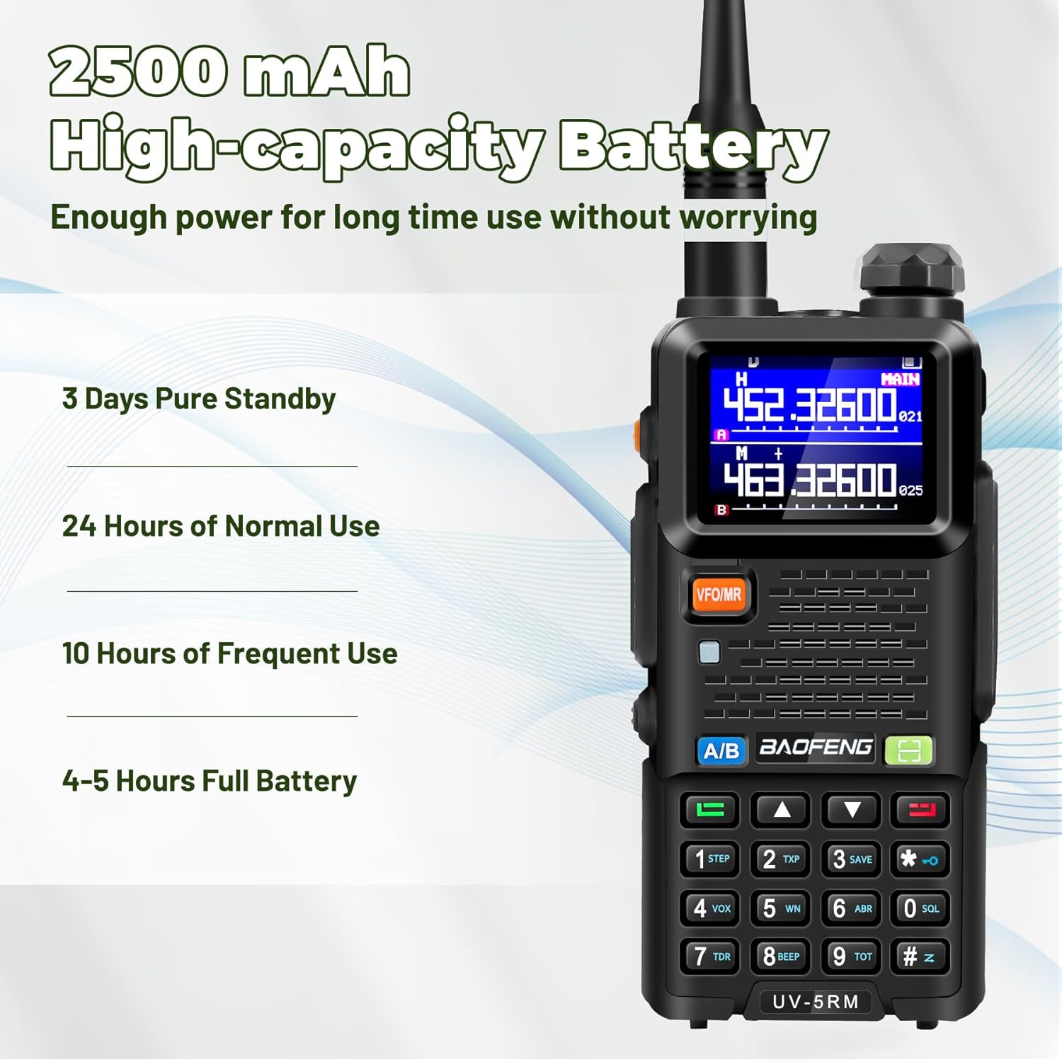 Superior BAOFENG Radio: UV5RM is a walkie-talkie loved by amateur radio enthusiasts and professional users. Compared with UV-5R, it has been significantly upgraded in many aspects. For example, UV-5RM provides a transmission power of up to 10W and is equipped with a large-capacity battery of 2500 mAh, with stronger signal and battery life. It supports more frequency bands, is fitted with a larger screen, has clearer sound quality, and has stronger anti-interference capabilities. Overall, the 5RM radio provides a better user experience and is suitable for multiple scenarios.