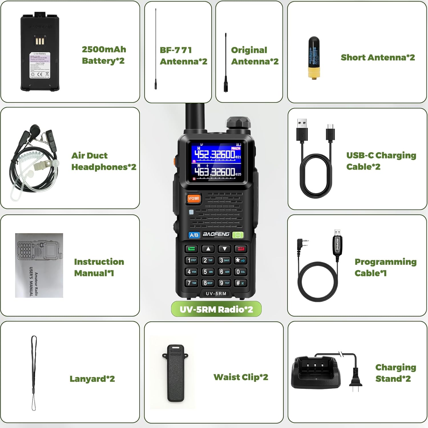 High-quality Walkie-talkie Set: UV-5RM’s 10W high power makes signal coverage wider. BAOFENG ham radio set is also equipped with three antennas, which can adapt to a variety of environments and meet your diverse communication needs. The BF-771 long antenna is suitable for open areas or occasions where long-distance communication is required. The medium/short-range antenna is suitable for short-distance communication scenarios such as inside buildings or in the city center.