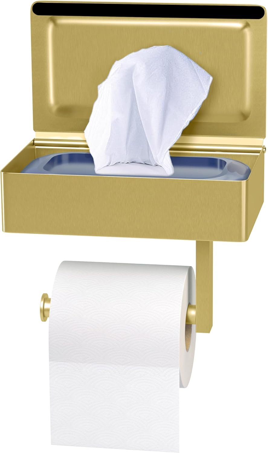 🟢【Hidden Wipes Storage】Our gold toilet paper holder wall mount has a built-in wipes organizing box that fixes the problem of leaving your flushable wipes out and keep them stored right where you need them while hidden out of sight. This is ideal solution for discretely storing your wet wipes, feminine products, or other private bathroom essentials.