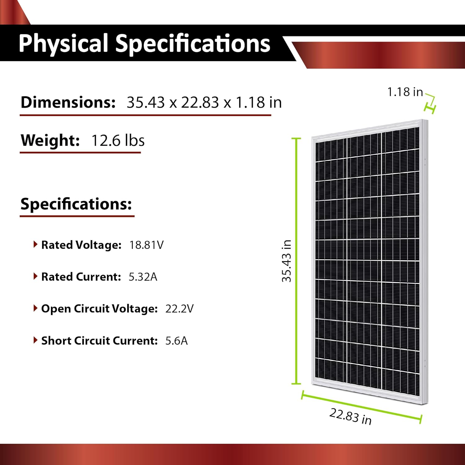 Cell Type: MonocrystallineRated Voltage [Vmpp]: 18.81VRated Current [Impp]: 5.32AOpen Circuit Voltage [Voc]: 22.2VShort Circuit Current [Isc]: 5.6ADimensions: 35.43 x 22.83 x 1.18 inWeight: 12.6 Lbs