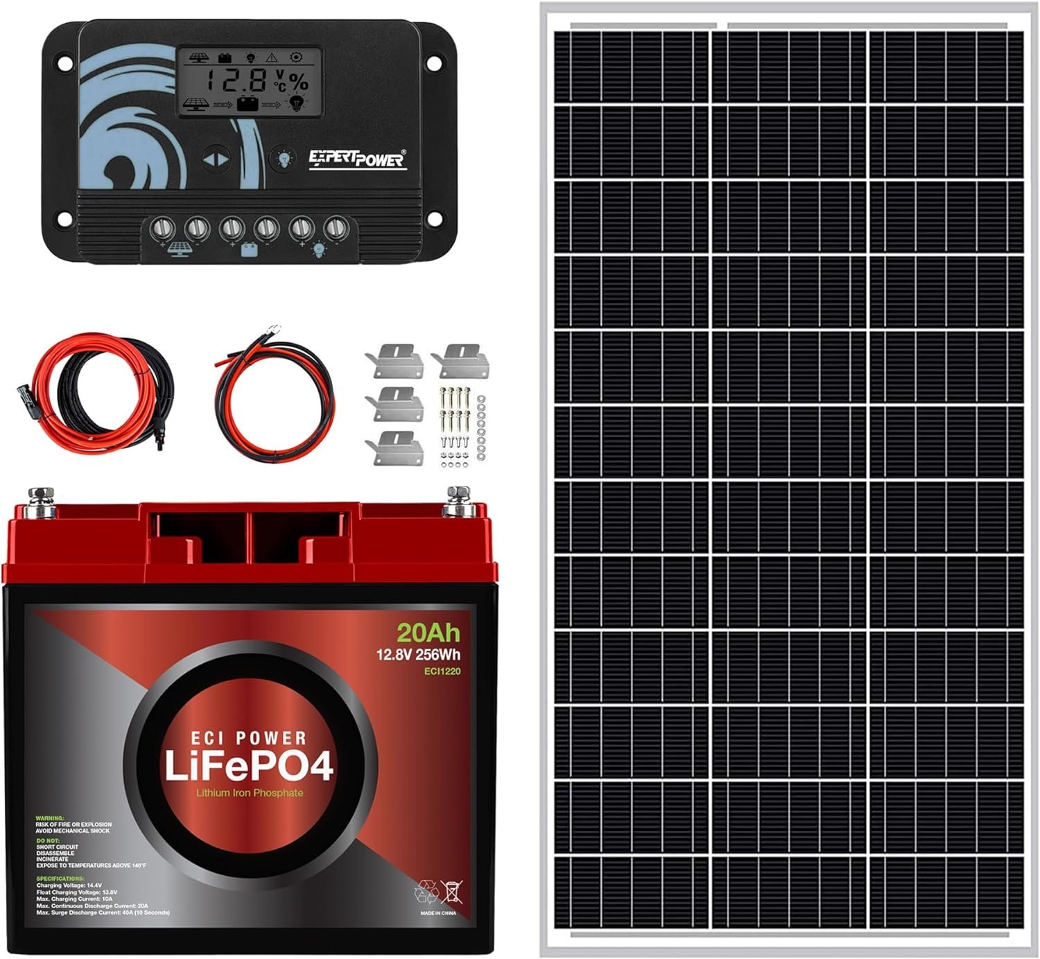 1 x 100W Solar Panel1 x 10A PWM Solar Charge Controller1 x 12V 20Ah LiFePO4 Battery1 x Panel-Controller Cables1 x Controller-Battery Cables1 x Set 4 Z-Brackets & Hardware