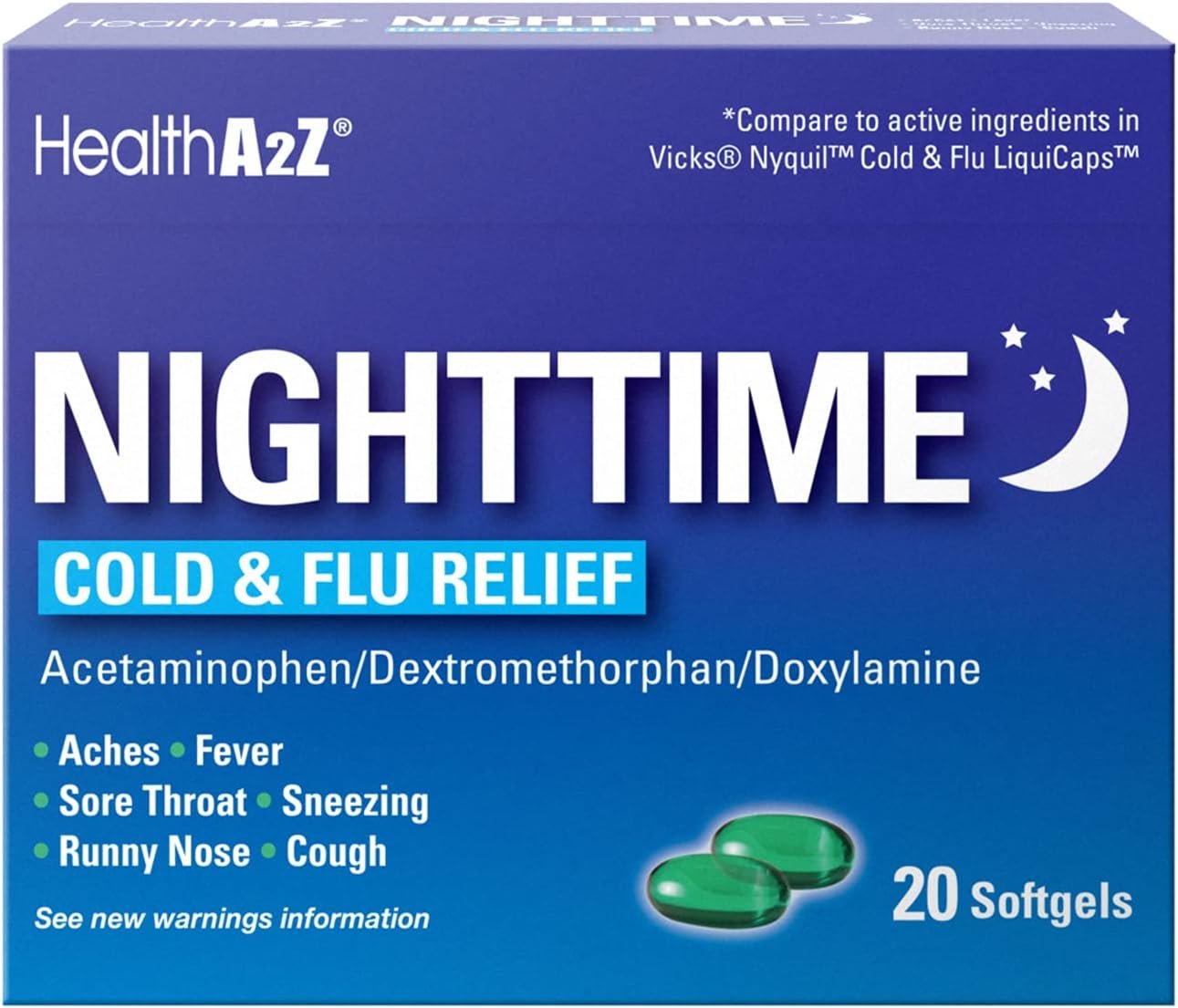 HealthA2Z Nighttime Cold-Flu Relief is an over-the-counter medication that treats symptoms of the common cold and flu such as sneezing, sore throat, headache, minor aches and pains, fever, runny nose, and cough. Relieves cold symptoms so you can sleep better.