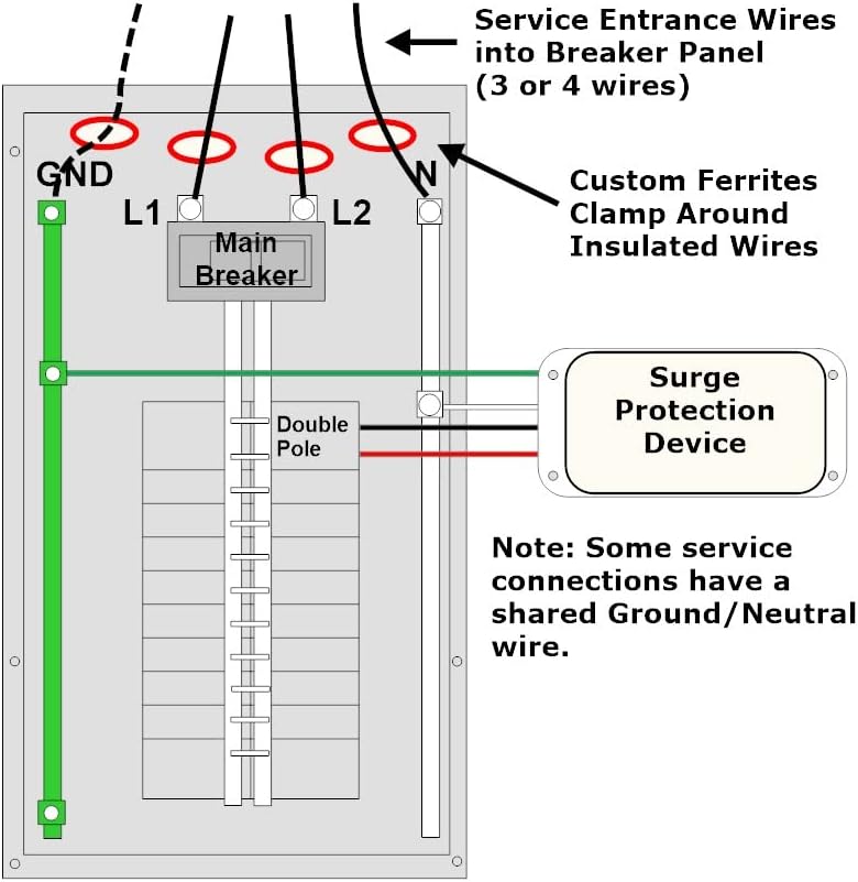 Typical installation shown below. Always consult manufacturer’s instructions, and have a professional electrician do the installation for safety. Please note that ferrites tend to make a humming or buzzing noise when high currents flow through them.