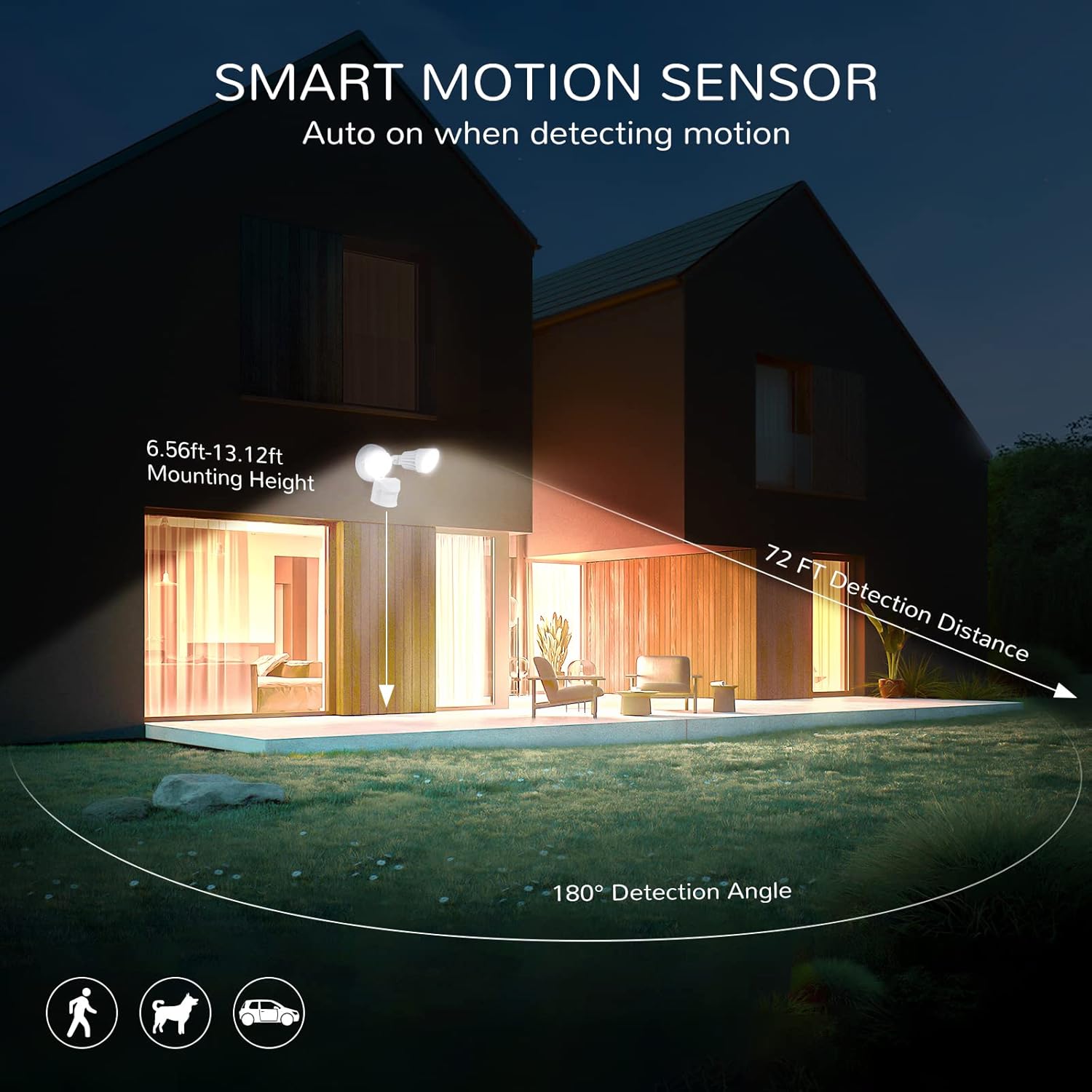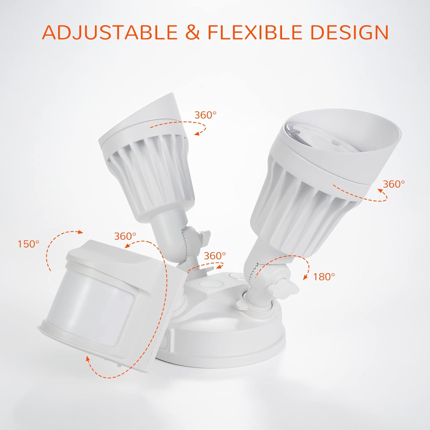 𝙄𝙋65 𝙒𝘼𝙏𝙀𝙍𝙋𝙍𝙊𝙊𝙁: Equiped with strong motion sensor which has a high sensitive sensing angle of 180 degree and a long sensitive distance of 72 FT, perfect for most situations for home and commercial use.IP65 waterproof rating ensures that your 2 head outdoor led motion sensor light won’t give in to resist weather (Rain, sleet or snow ) and UV exposure, anti-rusting and erosion.