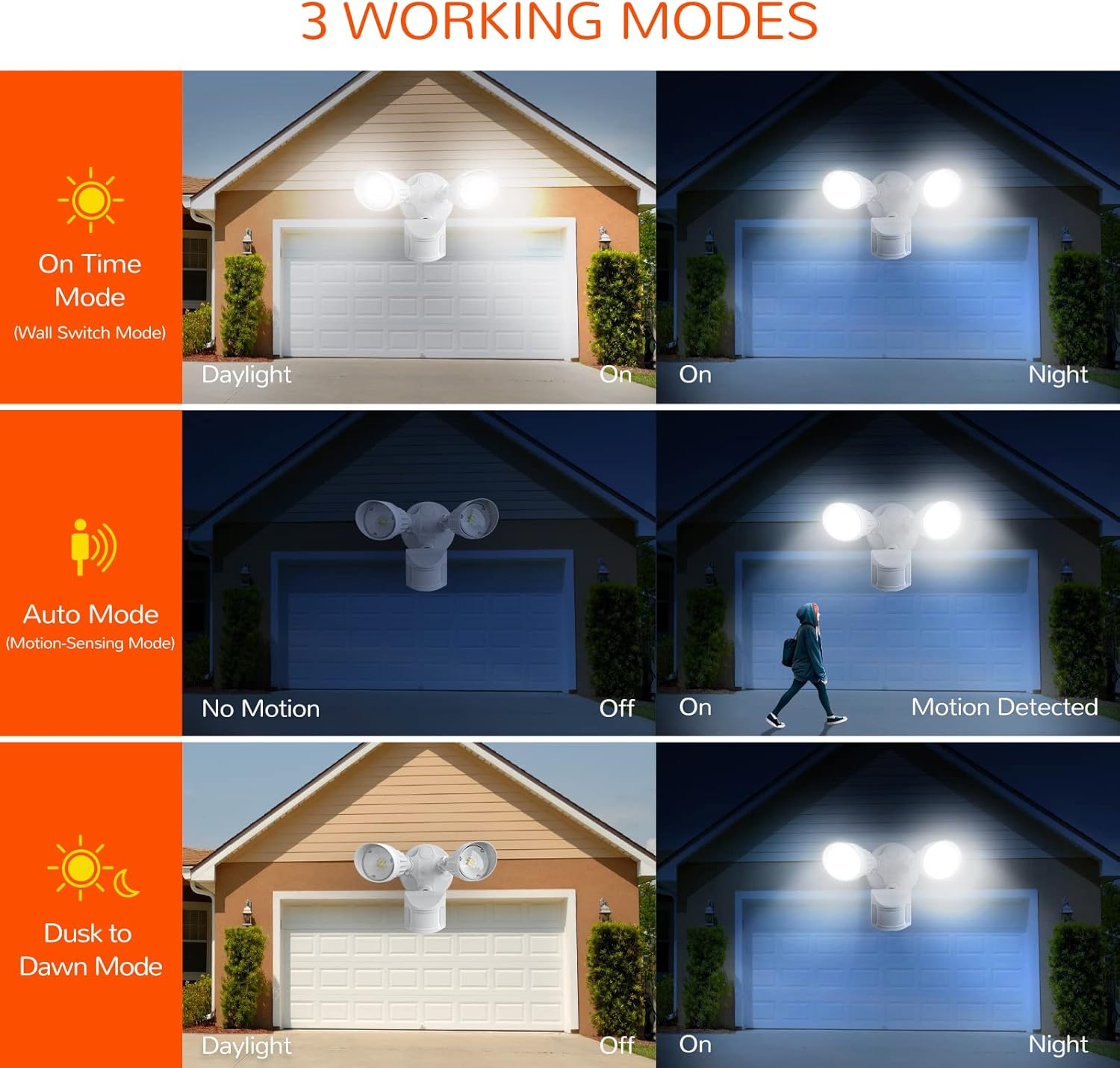 𝙎𝙐𝙋𝙋𝙊𝙍𝙏 3 𝙒𝙊𝙍𝙆𝙄𝙉𝙂 𝙈𝙊𝘿𝙀𝙎: On-Time Mode allows manual control on and off of the light;AUTO mode:when movement is detected in darkness the light will turn on & after 5 seconds to 5 minutes it will turn off depending on your setting on the “Time” knob; D2D(Dusk To Dawn) Mode will automatically turns on at night and stays off at daytime, work only in the night.