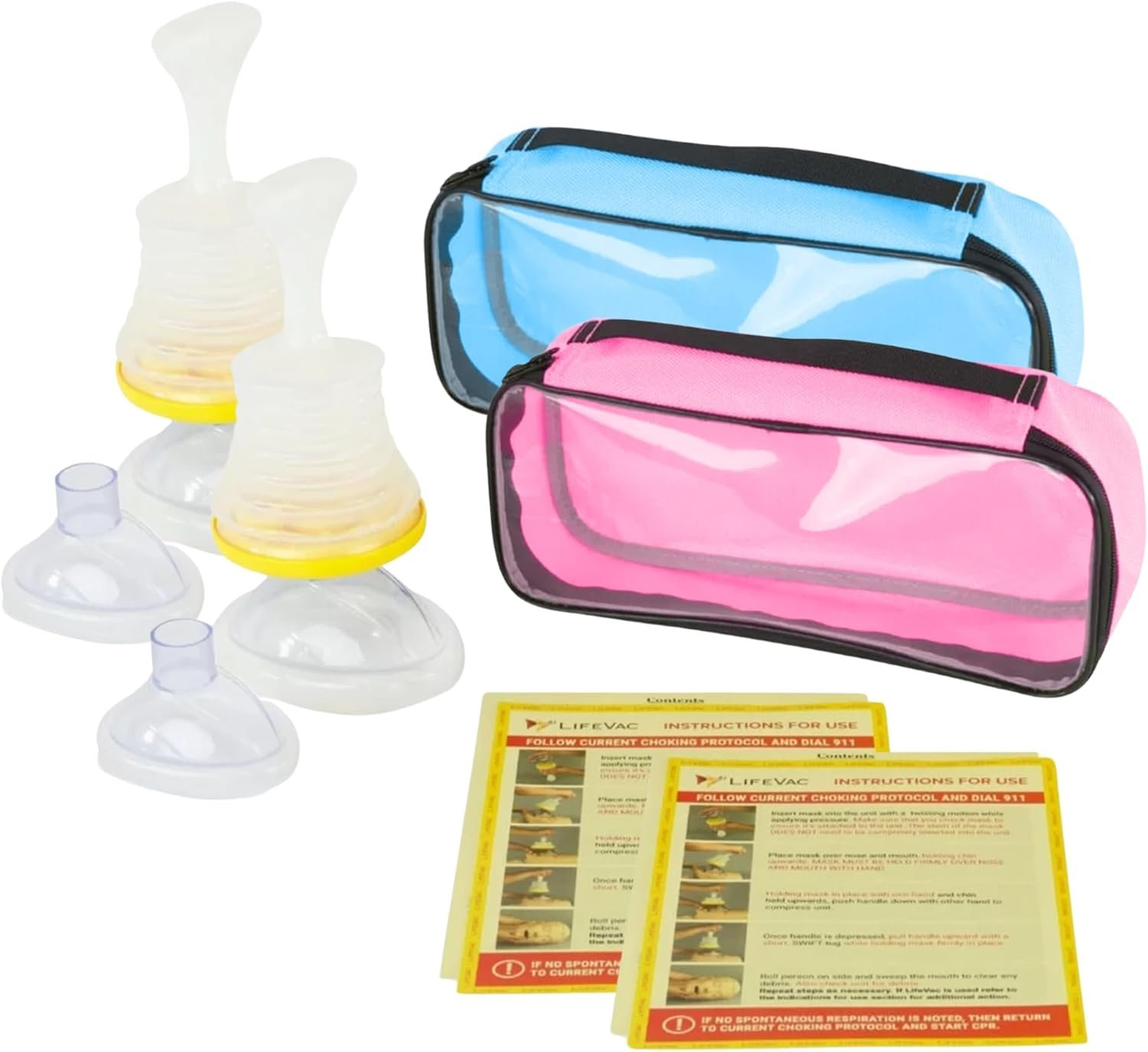 Travel Kit, 2-Pack Bundle Includes: (2) LifeVac suction devices, (2) pediatric kids & baby masks, (2) adult masks, (2) transparent zippered bags (1 Blue, 1 Pink), along with (2 sets) of instructions for use, and “Report a Life Saved” guides