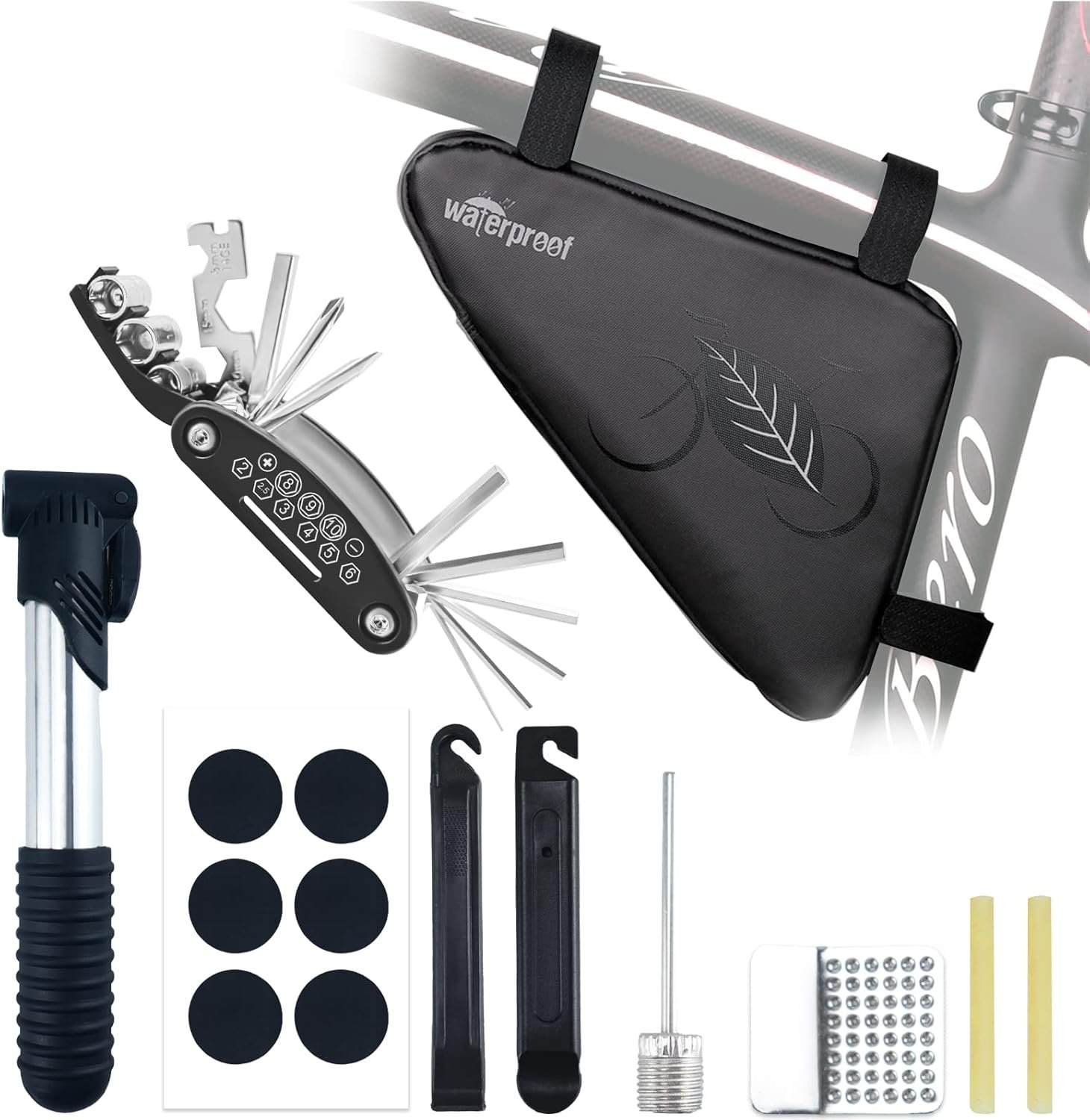Essential Bike Repair Tool Professional Kits: NDakter bicycle accessories include a bike triangle frame bag, 120psi bicycle pump, 16 in 1 multi-function bicycle tool, bike patch kit, metal rasp, and bike tire levers. Ensure safety in a harsh environment and immediately continues to ride without danger. Perfect mountain bike tire repair kit! The bike repair tool kit is an ideal gift for bikers.