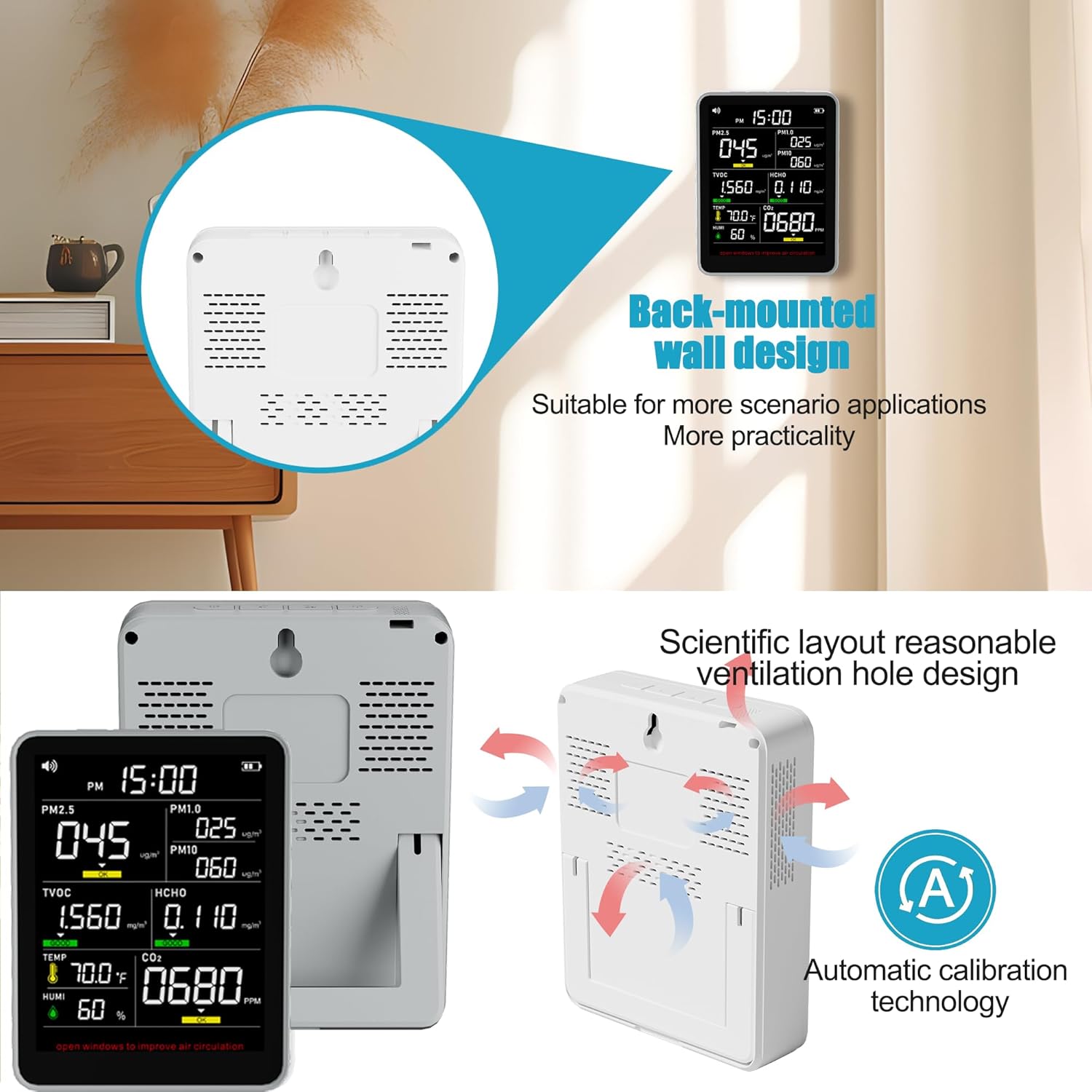 【Multifunctional & Easy to Read】Since clean air means a lot to every one. Indoor air quality monitor offers accurate monitoring of PM1.0,PM2.5,PM10,CO2, HCHO, TVOC, time,temperature and humidity, all displayed on utral-high definition color screen for people easy to identify and read, this monitor ensures you always know what’s in the air around you. With its convenient design, you can monitor the environment at any time and it efficiently measures 8 crucial indexes for evaluating air quality.