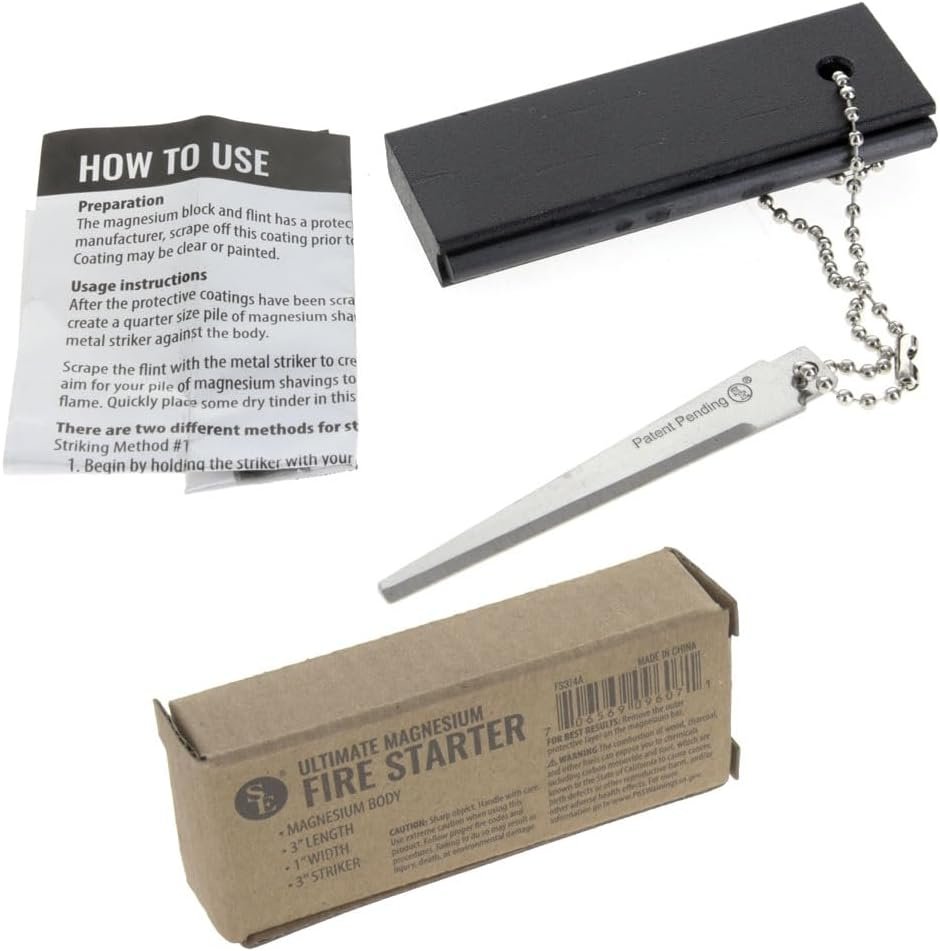 HOW TO USE:1 – Gather tinder (bark, dry branches, grass, lint, paper, pine needles, etc.) of the preferred size/amount.2 – Use the serrated edge of the striker to scrape along the length of the magnesium rod to create shavings.3 – You can either sprinkle the magnesium shavings throughout the tinder pile, or scrape the shavings into a cluster to the minimum size of a U.S. quarter coin.4 – Then hold the flint at an angle over the pile, while forcefully sliding your striker along the length of the flint to create sparks.5 – Continue to slide the striker against the flint until the sparks land directly onto the shavings pile and ignite a flame.