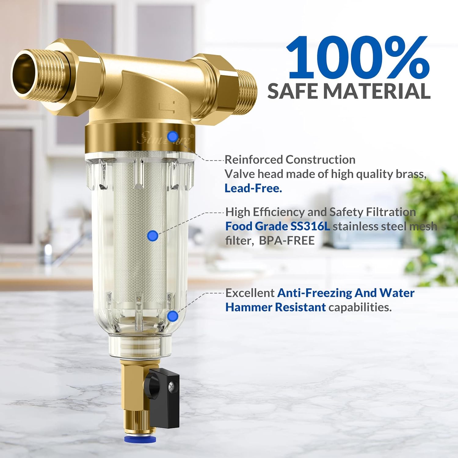 100% SAFE MATERIAL: BPA FREE. 40 Micron food grade stainless steel mesh filter to reduce and capture particles larger the 40μm (half the thickness of a human hair!) from entering your home. Valve head is made of high-quality brass. The transparent screen filter bowl can withstand a burst pressure of more than 725 psi (5Mpa), has excellent anti-freezing and water hammer-resistant capabilities.