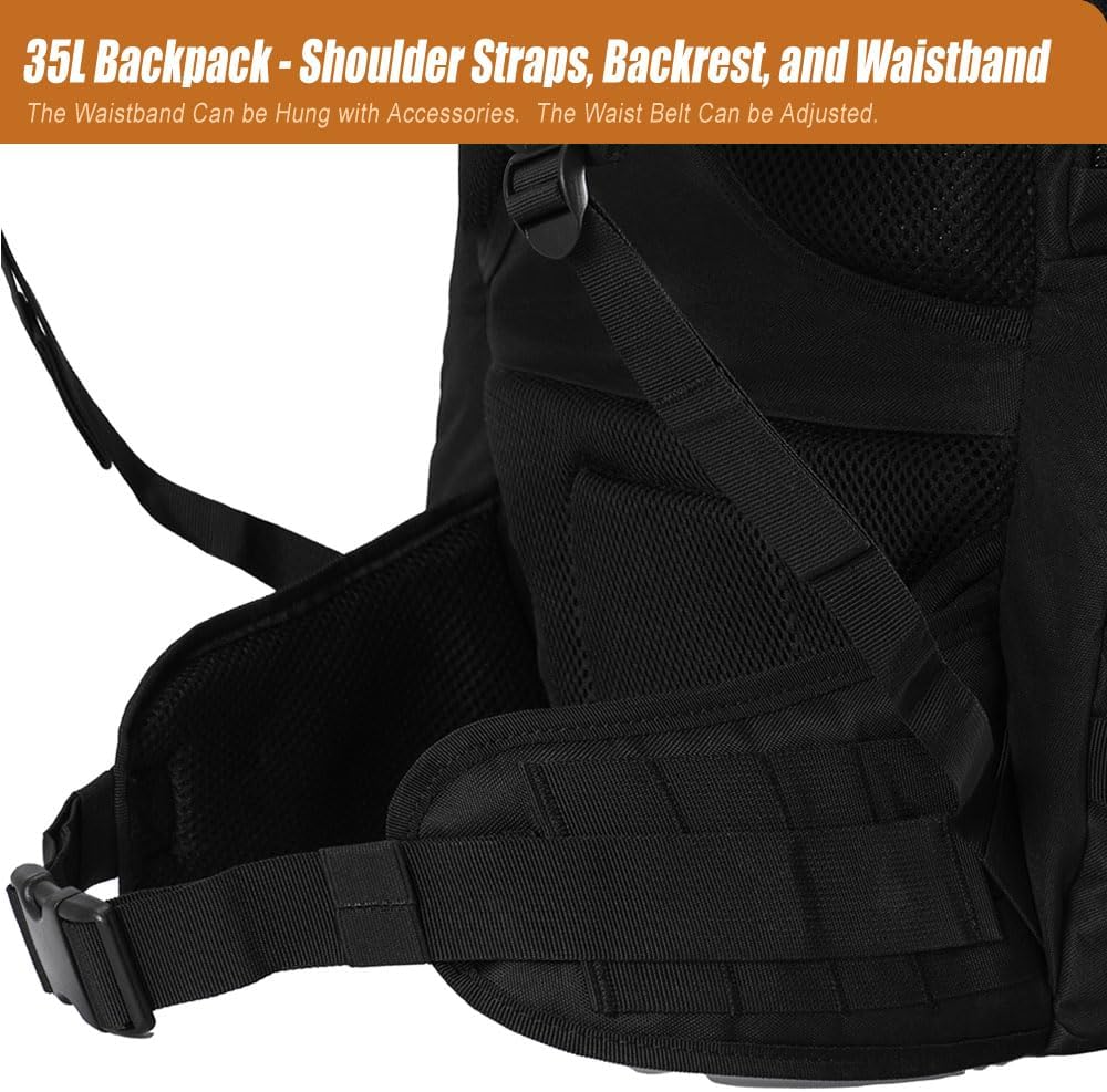 This 35L Military Tactical Backpack is Made of 600D Polyester, YKK Zippers & Duraflex Buckles. This Hiking Daypacks is Equipped with 10 D-Rings and 2 Tactical Patch. Tactical Backpack Size Appro: 12″*20″*11.2″ / 30*50*28CM (W*H*D), and Appropriately Sized 35L Capacity.