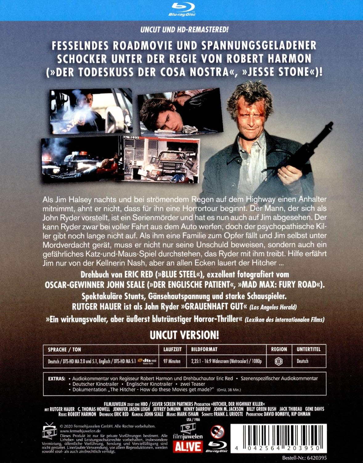 Germany released, Blu-Ray/Region A/B/C : it WILL NOT play on regular DVD player. You need Blu-Ray DVD player to view this Blu-Ray DVD: LANGUAGES: English ( DTS 5.1 ), English ( DTS-HD Master Audio ), German ( Dolby Digital 2.0 ), German ( DTS 5.1 ), German ( DTS-HD Master Audio ), German ( Subtitles ), WIDESCREEN (2.35:1), SPECIAL FEATURES: Booklet, Commentary, Documentary, Interactive Menu, Photo Gallery, Remastered, Scene Access, Teaser(s), Trailer(s), Uncut, SYNOPSIS: A young man transporting a car to another state is stalked along the road by a cunning and relentless serial killer who eventually frames the driver for a string of murders. Chased by Police and shadowed by the killer, the driver’s only help comes from a truck stop waitress. …The Hitcher