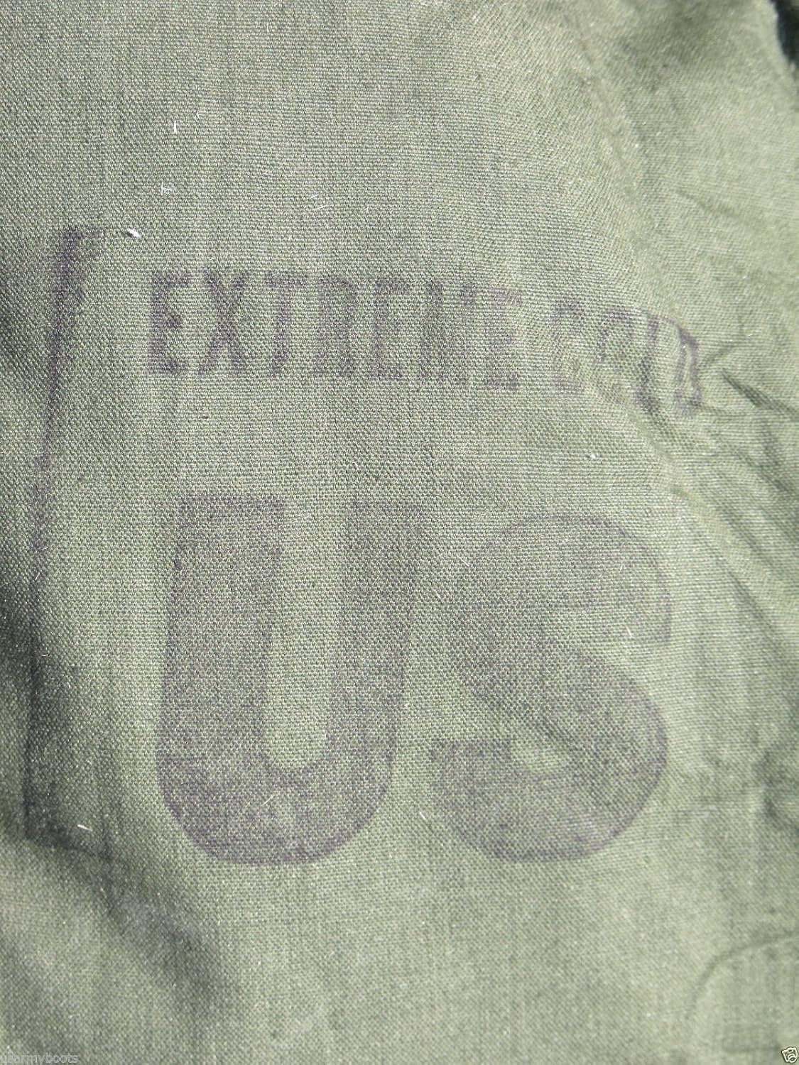 Us Military Issue Extreme Cold Weather Sleeping Bag in Od Green. These are the thickest warmest bags I ever had. [Other “Extreme Cold Weather” Bags are thinner] NEW – New old stock (NOS): Never issued,never used.May show some light cosmetic signs of long term storage. These are the Real Old School Heavy Duty Sleeping Bags. These sleeping bags are made of water-repellent poplin cotton outer shell with 80% down 20% polyester filling. They feature a 64in long zipper, offset stitching at the seams and a 3 in storm flap with snaps over the zipper rated for -20°F. Mummy style bags with a draw cord hood. These bags are 84 inches long, 30in wide at the top and 14in at the bottom and weigh 8lbs. They were issued from the 1970’s into the early 2000’s. Made in USA.